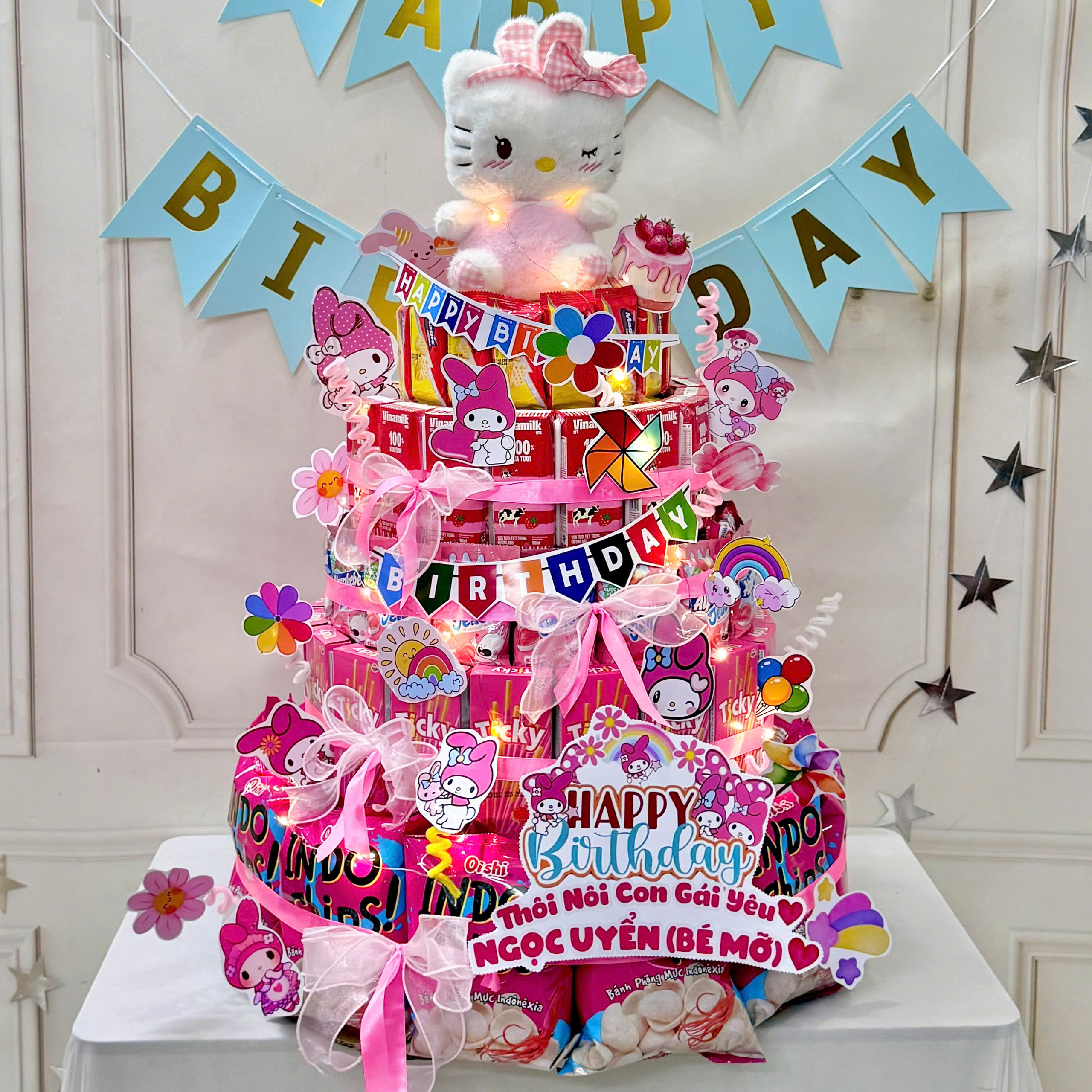 Bánh được trang trí từ các loại bánh, kẹo, sữa và snack, kết hợp cùng thú bông và nhân vật hoạt hình dễ thương.